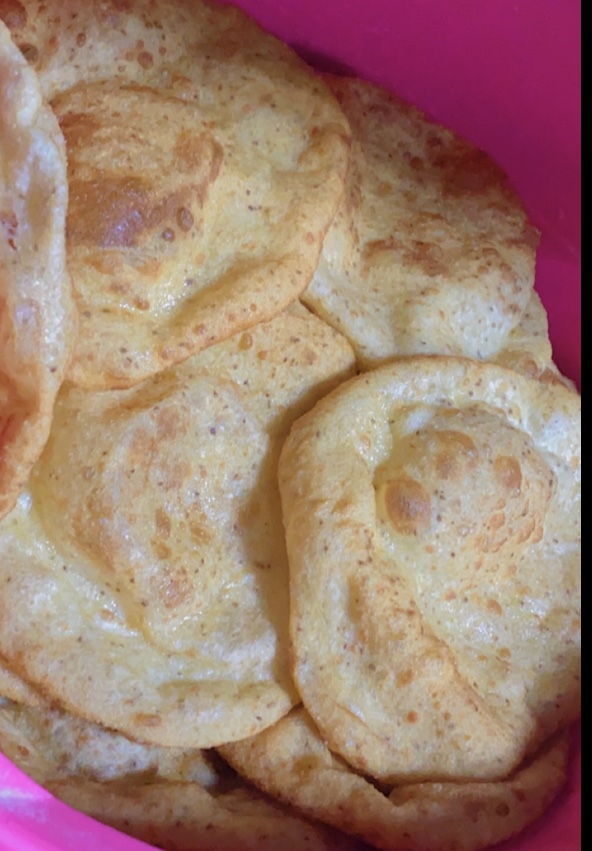 7. Remove the bhature from the oil using a slotted spoon and place them on a paper towel-lined plate to absorb excess oil.